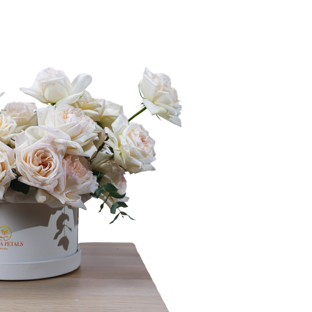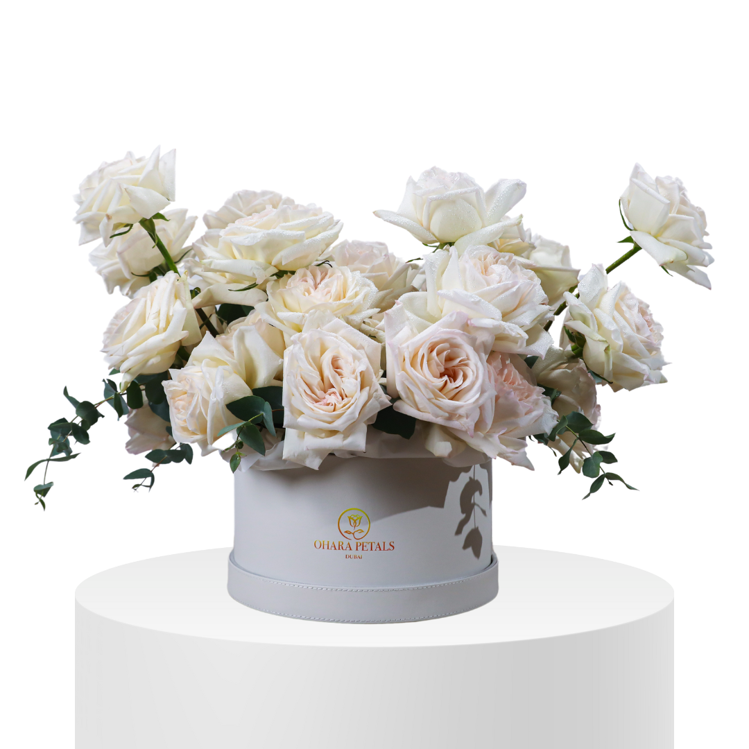 To maintain the beauty of your hatbox arrangement, keep it in a cool, dry place away from direct sunlight. Light dusting is recommended to preserve the fresh look of the flowers. Enjoy the timeless elegance of the O’Hara White Garden style!